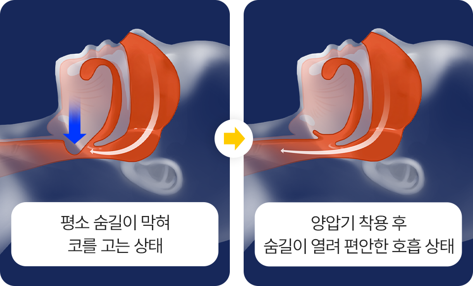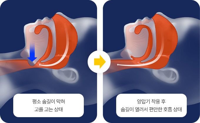양압기 착용을 통해 잠자는 동안 공기압력을 넣어 좁아져있는 숨길을